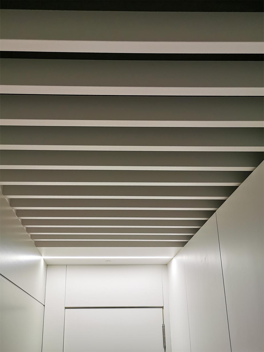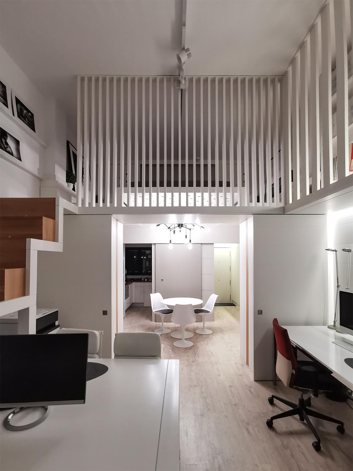 Proyecto de Arquitectura de adecuación de local para estudio de arquitectura y/o vivienda estudio creando una entreplanta en un loft diáfano jugando con las alturas para dar lugar a los espacios de sala de reuniones/comedor, sala de trabajo/salón y almacenaje/dormitorio. La estructura de acero forrada de madera lacada crea un espacio limpio y agradable tanto para la realización en este caso de trabajos de arquitectura. Estos espacios de trabajo se pueden convertir cambiando el mobiliario en espacios de una vivienda.