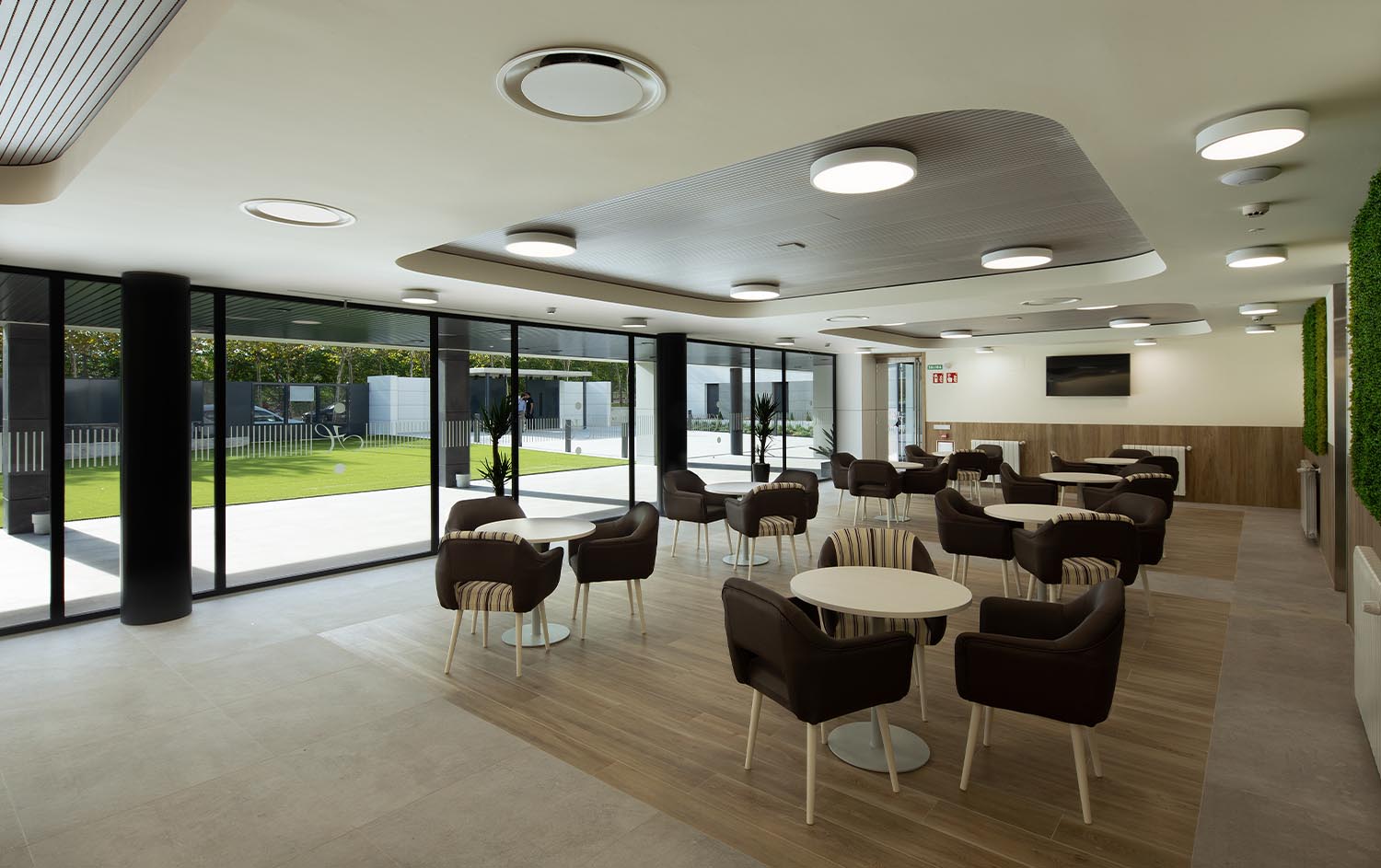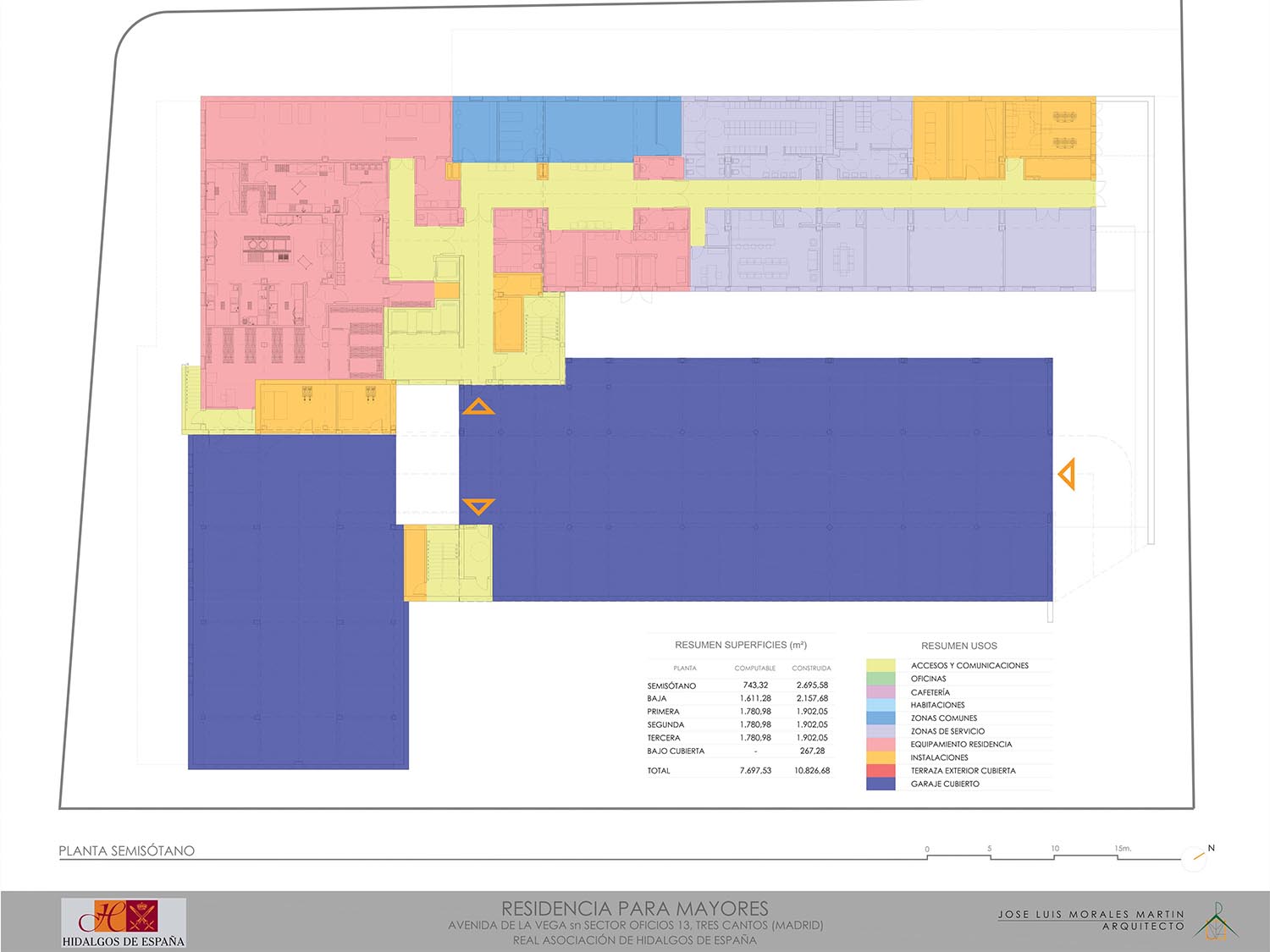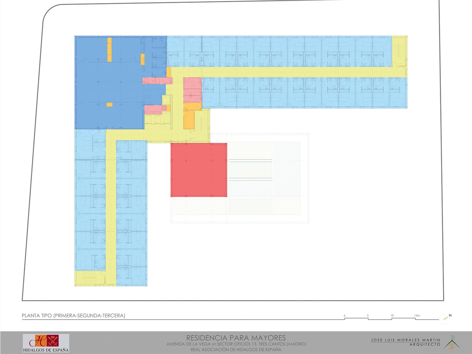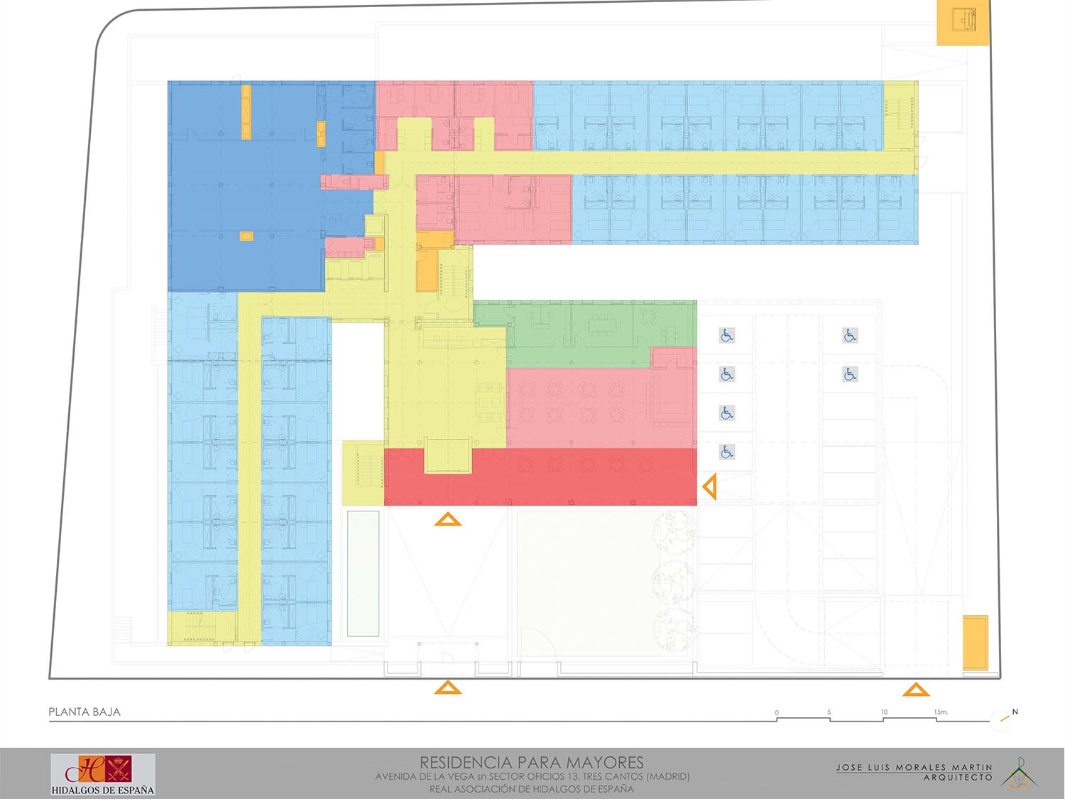 Proyecto de Arquitectura y Dirección de Obra de Residencia para mayores en Tres Cantos dotada de 157 plazas que se divide en cuatro miniresidencias con todas las estancias necesarias para el cuidado diario de las personas mayores, incluyendo rehabilitación, terapia, comedor, sala de estar, terraza exterior, para así evitar el tráfico vertical. Está dotada de zona medicalizada, cafetería para residentes y jardines exteriores.